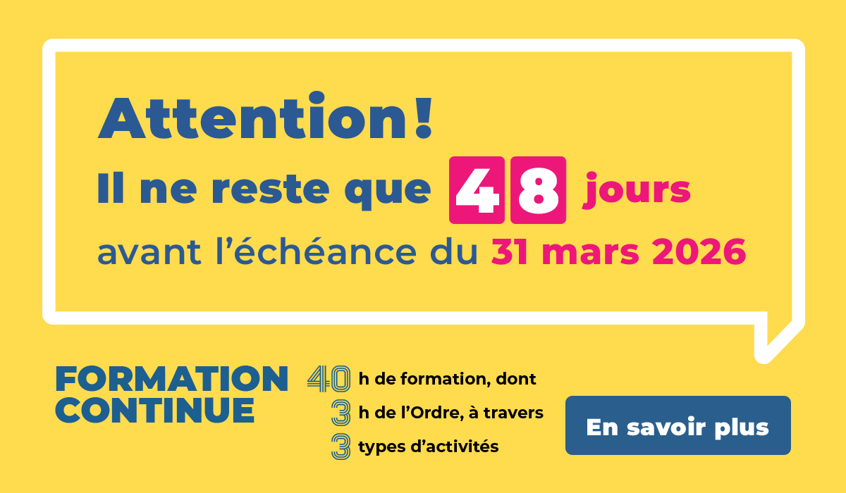 C’est le moment de renouveler votre inscription annuelle au tableau de l’Ordre et de payer votre cotisation pour 2026-2027 dans votre dossier en ligne, sous l’onglet « Inscription au tableau ».