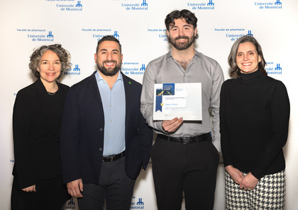 Nathalie Letarte, vice-doyenne aux études en pharmacie et à la vie étudiante, Georges Farah, représentant de l'Ordre des pharmaciens du Québec, Jamey Scraire, lauréat, et Ema Ferreira, responsable du programme Pharm.D.
